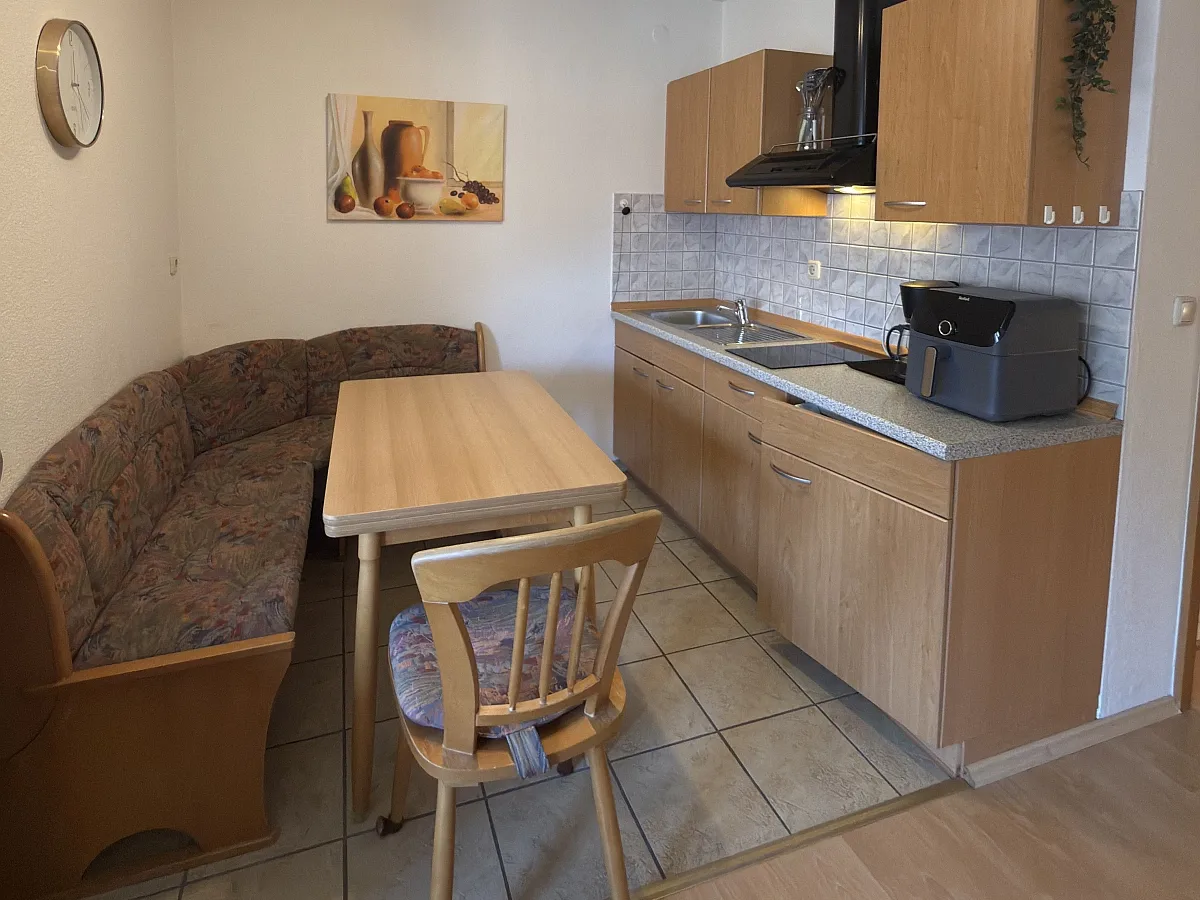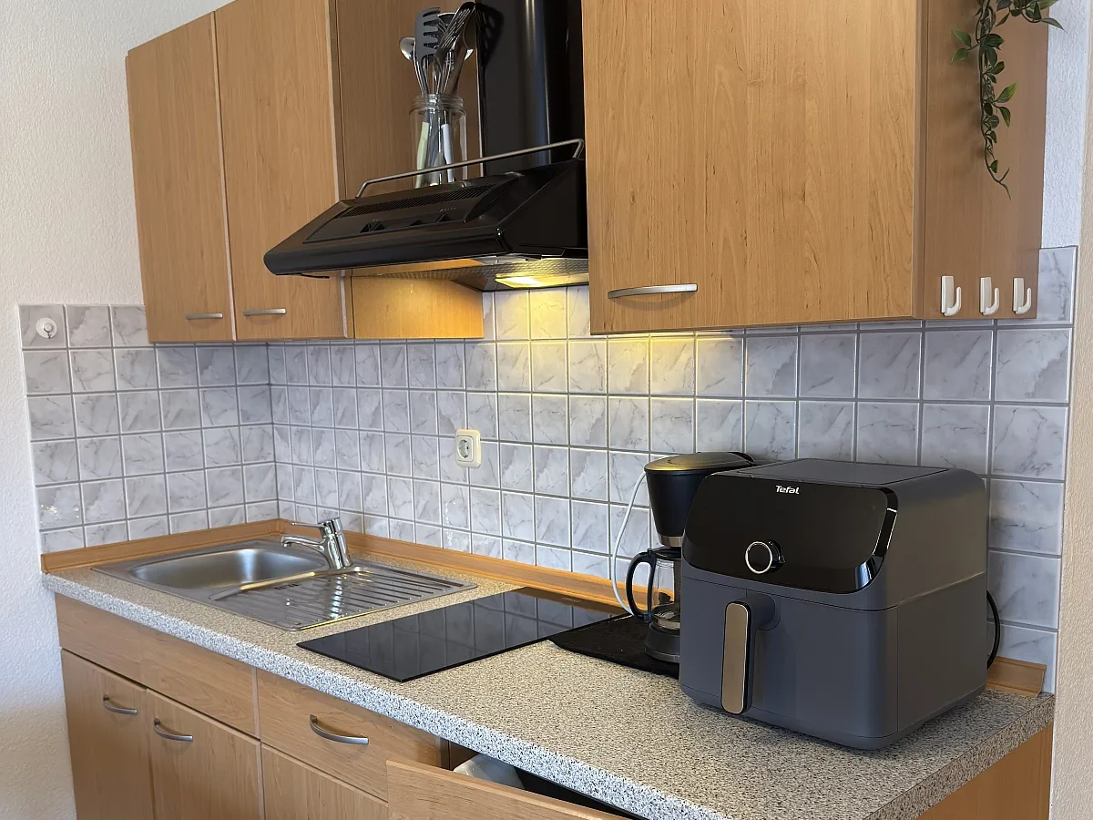 - Singleküche mit kleinem Kochfeld, Heißluftfritteuse, Spüle, Kühlschrank, Toaster, Besteck, Tassen, Tellern, Kochgeschirr, Kaffeemaschine und Wasserkocher